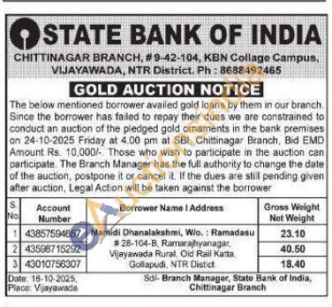 State Bank of India Gold Auctions Auction in Vijayawada