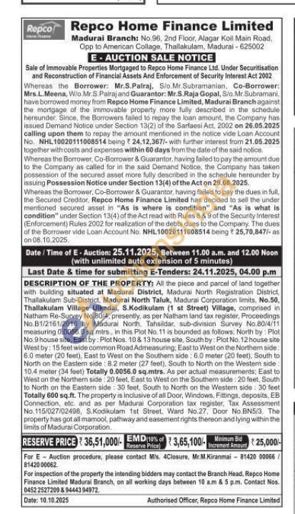 DESCRIPTION OF THE PROPERTY: All the piece and parcel of land together with building situated at Madurai District, Madurai North Registration District, Thallakulam Sub-District, Madurai North Taluk, Madurai Corporation limits, No.50, Thallakulam Village Ulkadai, S.Kodikulam (1 st Street) Village, comprised in Natham Re-Survey No. 80/4, presently, as per Natham land tax register, Proceedings No.B1/2161/2010 by Madurai North, Tahsildar, sub-division Survey No.80/4/11 measuring 0.0056.0 sq mirs, in this Plot No. 11 is bounded as follows: North by: Plot No.9 house site, East by: Plot Nos. 10 & 13 house site, South by: Plot No. 12 house site West by: 15 feet wide common Road Admeasuring, East to West on the Northern side 6.0 meter (20 feet), East to West on the Southern side: 6.0 meter (20 feet), South to North on the Eastem side: 8.2 meter (27 feet), South to North on the Western side: 10.4 meter (34 feet) Totally 0.0056.0 sq.mtrs. As per actual measurements: East to West on the Northern side 20 feet, East to West on the Southern side: 20 feet, South to North on the Eastern side: 30 feet, South to North on the Western side: 30 feet Totally 600 sq.ft. The property is inclusive of all Door, Windows, Fittings, deposits, EB Connection, etc. and as per Madurai Corporation tax register, Tax Assessment No. 115/027/02498, S.Kodikulam 1st Street, Ward No.27, Door No.BN5/3. The property has got all mamool, pathway and easement rights thereon and lying within the limits of Madurai Corporation