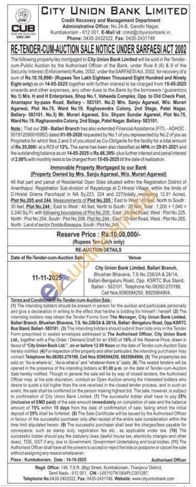 All that part and parcel of Residential Open Sites situated within the Registration District of Ananthapur, Registration Sub-division of Rayadurga at D. Hirelal Village, within the limits of D. Hirelal Grama Panchayat in NA Sy.223, 224 and 227 totally measuring 12.91 Acres). Plot No.205 and 244. Measurements of Plot No.205: East to West: 40 feet, North to South 30 feat. Plot No 244: East to West: 40 feet, North to South: 28 feet. Total: 1,200+1,040 2.240 Sq Ft. with following boundaries of Plot No.205 East: 20 feet Road, West: Plot No.225 North Plot No.204, South Plot No. 206. Plot No 244: East: 20 feet Road, West. Plot No.205. North: Land of sector Dodda Basappa, South: Plot No.245.