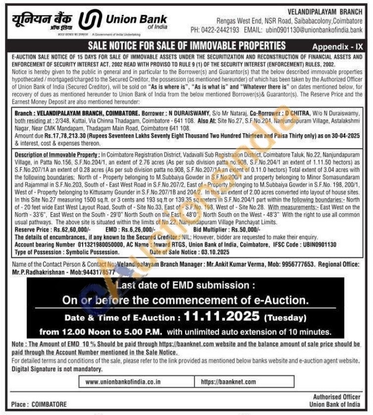 In Coimbatore Registration District, Vadavalli Sub Registration District, Coimbatore Taluk, No.22, Nanjundapuram Village, in Patta No. 156. S.F.No.204/1, an extent of 2.76 acres (As per sub division patta no.908, S.F.No.204/1 an extent of 1.11.50 hectors) as S.F.No.207/1A an extent of 0.28 acres (As per sub division patta no.908, S.F.No.207/1A an extent of 0.11.0 hectors) Total extent of 3.04 acres with the following boundaries: North of Property belonging to M.Subbaiya Gowder in S.F.No.200/1 and property belonging to Minor Somasundaram and Rajammal in S.F.No.203, South of - East West Road in S.F.No.207/2, East of Property belonging to M.Subbaiya Gowder in S.F.No. 198, 200/1, West of - Property belonging to Kittusamy Gounder in S.F.No.207/18 and 204/2. In this an extent of 2.00 acres converted into layout of house sites. In this Site No.27 measuring 1500 sq.ft. or 3 cents and 193 sq.ft or 139.35 sq.meters in S.F.No.204/1 part within the following boundaries:- North of-20 feet wide East West Layout Road, South of Site No.33, East ofS.F.No. 198, West of Site No.28. With measurements: East West on the North-33'6", East West on the South-29'0" North South on the East-48'0", North South on the West-48'3" With the right to use all common usual pathways. The above site is situated within the limits of No.22, Nanjundapuram Village Panchayat Limits.