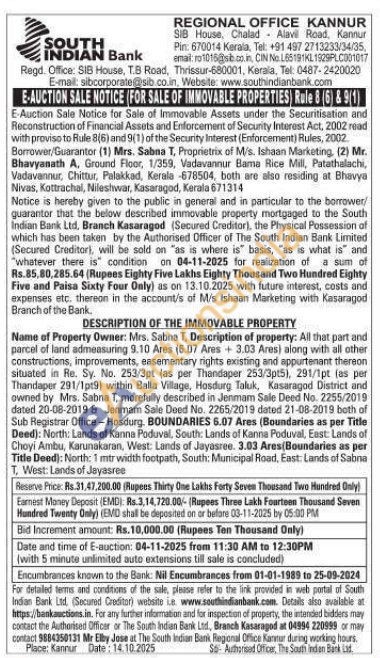All that part and parcel of land admeasuring 9.10 Ares (6.07 Ares + 3.03 Ares) along with all other constructions, improvements, easementary rights existing and appurtenant thereon situated in Re. Sy. No. 253/3pt (as per Thandaper 253/3pt5), 291/1pt (as per Thandaper 291/1pt9) within Balla Village, Hosdurg Taluk, Kasaragod District and owned by Mrs. Sabna T, morefully described in Jenmam Sale Deed No. 2255/2019 dated 20-08-2019 & Jenmam Sale Deed No. 2265/2019 dated 21-08-2019 both of Sub Registrar Office-Hosdurg. BOUNDARIES 6.07 Ares (Boundaries as per Title Deed): North: Lands of Kanna Poduval, South: Lands of Kanna Poduval, East: Lands of Choyi Ambu, Karunakaran, West: Lands of Jayasree. 3.03 Ares (Boundaries as per Title Deed): North: 1 mtr width footpath, South: Municipal Road, East: Lands of Sabna T, West: Lands of Jayasree