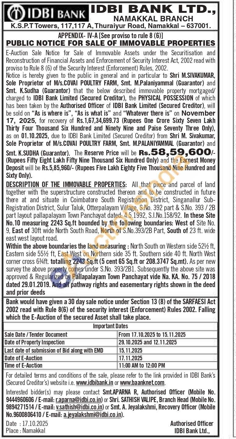 All that piece and parcel of land together with the superstructure constructed thereon and to be constructed in future there at and situate in Coimbatore South Registration District, Singanallur Sub-Registration District, Sulur Taluk, Otterpalayam Village, S.No. 392 part & S.No. 393/2B part layout pallapalayam Town Panchayat dated: 4.5.1992, S.I.No. 158/92. In these Site No. 10 measuring 2243 Sq.ft bounded by the following boundaries: West of Site No. 9. East of 30ft wide North South Road, North of S.No.393/2B Part, South of 23 ft. wide east west layout road.