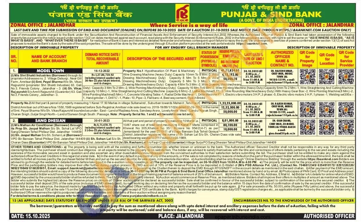 Property No.2 All that part & parcel of property measuring 1 Kanal 17.50 Marlas in village Sultanwind, Suburban towards Mahal-II, Tehsil and District Amritsar out of Khasra Nos 1550, 1569 registered before Sub-Registrar, Amritsar vide sale deed no. 2018-19/89/1/1024 dated 07-09-2018 in the name of Smt. Payal Sharma W/o Sh. Vikas Rajpurohit bounded asunder: East-Land of Rajdeep Arora, Sandeep Arora, Lovely Arora West-Land of Nanak Singh Charan Singh, Guljar Singh North-Land of Sarwan Singh South: Passage. Note: Property Serial No. 1 and2 will be soldin one lot only