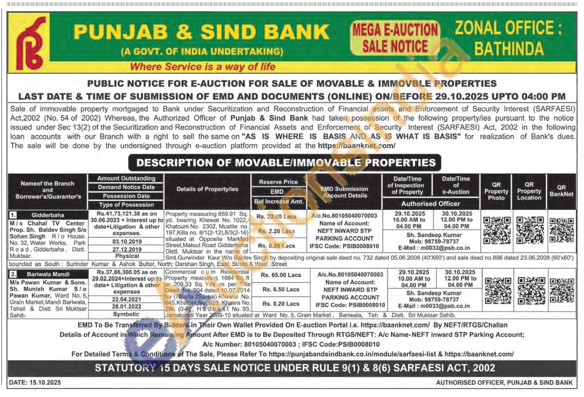 Commercial cum Residential Property measuring 1884 Sq. ft or 209.33 Sq. Yds as per Title Deed No. 304 dated 10.07.2014 for (7Marla 2Sarsai) Khewat No. 645, Khatoni No. 823, Khasra No. 296 (0-8), Hadbast No. 93 Jamabandi Year 2009-10 situated at Ward No. 5, Grain Market, Bariwala, Teh & Distt. Sri Muktsar Sahib.