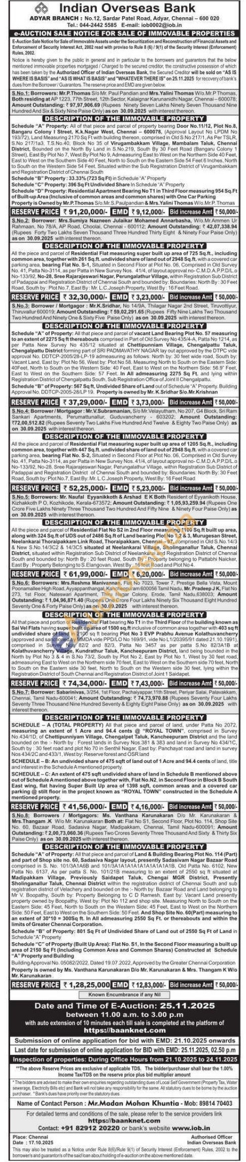 6) All that piece and portion of Residential Flat bearing No T1 in the Third Floor of the building known as Sai Vel Flats having super built up area of 1500 sq.ft inclusive of common area together with 403 sq ft undivided share of land in 2100 sq ft bearing Plot No 3 EVP Prabhu Avenue Kolathuvancherry (approved and sanctioned by MMDA vide PPD/LO No 169/91, vide No L1/20395/91 dated 21.10.1991). comprised in Survey Nos 82/2 and 82/3, Patta No 3457 as per patta S.No 82/3A1B at Kolathuvancherry Village, Kundrathur Taluk, Kancheepuram District, land being bounded in the North by Plot No 3 & 4 in S.No 73/2, South by Plot No 2, East by Plot No 1. West by 30 feet road, admeasuring East to West on the Northern side 70 feet, East to West on the Southern side 70 feet, North to South on the Eastem side 30 feet, North to South on the Western side 30 feet, lying within the Registration District of South Chennai and Registration District of Joint 1 Saidapet