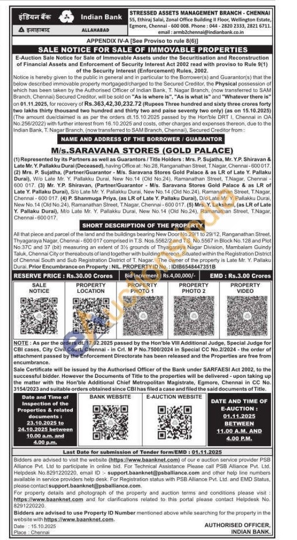 All that piece and parcel of the land and the buildings bearing New Door No.29/1 to 29/12, Ranganathan Street. Thyagaraya Nagar, Chennai-600017 comprised in T.S. Nos 5562/2 and T.S. No.5567 in Block No. 128 and Plot No. 37C and 37 (bit) measuring an extent of 3% grounds of Thyagaraya Nagar Division, Mambalam Guindy Taluk, Chennai City or thereabouts of land together with building thereon. Situated within the Registration District of Chennai South and Sub Registration District of T. Nagar. The owner of the property is Late Mr. Y. Pallaku Durai. Prior Encumbrance on Property: NIL PROPERTY ID No.: IDIB65484473518