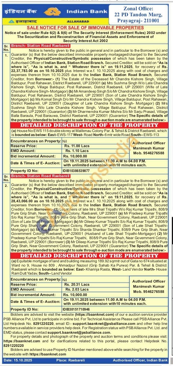 (a) House No EWS 115 double storey at Malikmau Colony Par. & Tehsil & District Raebareli, which is bounded as below: East-EWS-117 West-Road North-6 mtr wide Road South-EWS-113