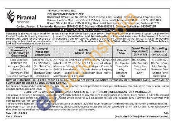 All The piece and Parcel of the Property having an extent RE SY NO 19/12/3 NA Manarcad Village, Manarcad Village, Kottayam, Kottayam Kerala IN 686015 Boundaries As: North Balance Property South Daniel East: Panchayath Road West vaniyapurackal & Gokulam