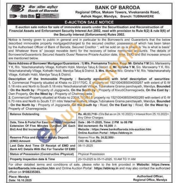 1. Commercial Property situated at Khata no 231/170/C, E property no 1521004085004000267 with extent of E-W 5.18 mtrs and North to South 5.18 mtrs Yelachakanahalli Village, Tubinakere Grama panchayath, Mandya, Bounded : On the North by: Property of Jogigowda, On the South by: Property of KivudiChannegowda, On the East by: Own Property, On the West by: Property of Channegowda. 2. Commercial Property situated at Khata no 230/A, 170/81 E property no 1521004085004000265 with extent of E-W 6.70 mtrs and North to South 7.01 mtrs Yelachakanahalli Village, Tubinakere Grama panchayath, Mandya, Bounded On the North by: Property of Jogigowda, On the South by: Road, On the East by: Road, On the West by: Property of Channegowda.