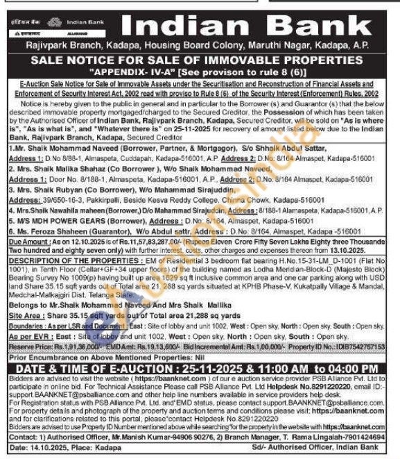 DESCRIPTION OF THE PROPERTIES: EM of Residential 3 bedroom flat bearing H.No. 15-31-LM_D-1001 (Flat No 1001), in Tenth Floor (Cellar+GF+34 upper floors) of the building named as Lodha Meridian-Block-D (Majesto Block) Bearing Survey No 1009(p) having built up area 1629 sq ft inclusive common area and one car parking along with USD land Share 35.15 sqft yards out of Total area 21, 288 sq yards situated at KPHB Phase-V, Kukatpally Village & Mandal, Medchal-Malkajgiri Dist. Telanga State.Belongs to Mr.Shaik Mohammad Naveed And Mrs Shaik Mallika