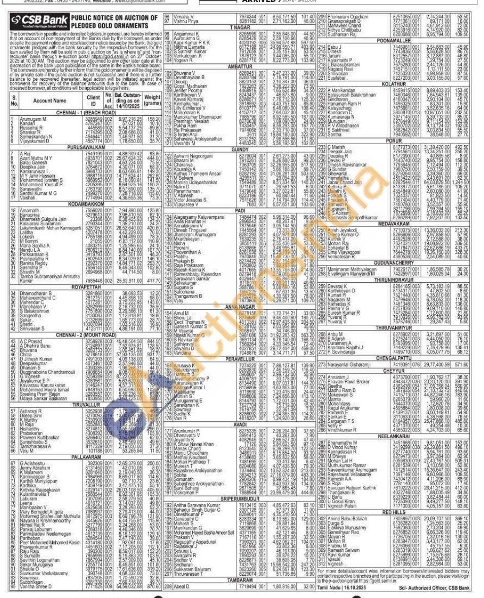 CSB Bank Gold Auctions Auction in Chennai