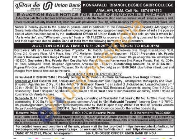 Schedule A: East Godavati Dist, Amalapuram Mandal, Amalapuram Sub Registry, Amalapuram Municipality and Town Bhupaiah Agaraharam, Z Dry, RS No. 444/5, "Sri Malayadri Towers" to an extent of Undivided and Unspecified area of 1/20 th 29.55 Sq Yards) 247 Sq.Meters with Stilt G+3 Floors RCC Residential Apartments bearing Dno, 4-2-79/10 Bounded by East: Bhupaiah Agraharam Road, South Road, West: Site of Kunchimanchi vari family, North: House of Kunchimanchi Venkta Ramana Schedule B: All that Part & Parcel of the Property consisting of Residential Flat bearing flat No. A (204). First Floor admesuring 1100 Sq.Ft (with Balconies and common Area) in "Sri Malayadri Towers", bearing Dno: 4-2-79/10. Bhupaiah Agraharam, Amalapuram Municipality bounded by: EAST: Open to sky, WEST: Flat No. B of Tanikella Venkata Satya Surya Nagabhushanam, SOUTH: Open to sky, NORTH: Common corridor thereafter open to sky