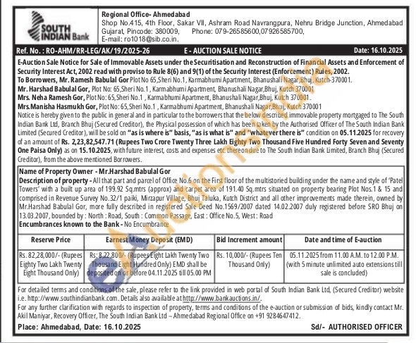 Description of property-All that part and parcel of Office No.6 on the First floor of the multistoried building under the name and style of 'Patel Towers' with a built up area of 199.92 Sq.mtrs (approx) and carpet area of 191.40 Sq.mtrs situated on property bearing Plot Nos. 1 & 15 and comprised in Revenue Survey No.32/1 paiki, Mirzapur Village, Bhuj Taluka, Kutch District and all other improvements made therein, owned by Mr.Harshad Babulal Gor, more fully described in registered Sale Deed No.1569/2007 dated 14.02.2007 duly registered before SRO Bhuj on 13.03.2007, bounded by: North: Road, South: Common Passage, East: Office No.5, West: Road Encumbrances known to the Bank-No Encumbrance