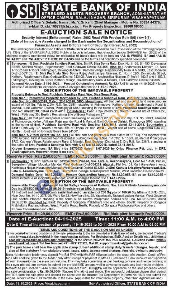 Item No.1: Immovable Property Mortgaged by Smt. Puchhala Sandhya Rani. W/o. Shri Siva Soma Raju, vide Doc. No. 6826/2018, Dated, 22-11-2016, SRO. Mogalthuru: All that part and parcel of land measuring an extent of 105 Sq. Yds in Z.Dry R.S. No. 238/1, situated at Pidingoyyä, Katheru Village, Rajahmundry Rural & Mandal, East Godavari District, Pidimgoyya SRO, standing in the name of Smt. Puchhala Sandhya Rani vide Doc No: 6826/2018, dated 22-11-2018. Boundaries: East: Raja Veedhi 35', South: Vacant site of Others 27", West: Path way 35', North: Remaining Site of Burra Prakasam 27. Item No.2: All that part and parcel of land measuring an extent of 82 Sq. Yds in Z. Dry R.S. No. 238/1, situated at Pidimgoyya, Katheru Village, Rajahmundry Rural & Mandal, East Godavari District, Pidimgoyya SRO, standing in the name of Smt. Puchhala Sandhya Rani vide Doc No: 6826/2018, dated 22-11-2018. Boundaries: East: Path way 30, South: Vacant site of Others 24 06", West: Vacant site of Somu Nageswara Rao 30. North: Joint wall of Jonnada Surya Rao 24'06" Item No.1 & 2 total extent 187 Sq. Yds: All that part and parcel of a total extent of 187 Sq. Yds together with RCC Ground, First & Second floor Residential building bearing D.Nos. 1-153/2, 1-153/3, situated at Pidimgoyya. SRO, Katheru Village, Rajahmundry Rural & Mandal, East Godavari District, in Z. Dry R.S. No. 238/1, standing in the name of Smt. Puchhala Sandhya Rani vide Doc No: 6826/2018, dated 22-11-2018. Known Encumbrances: SA filed vide 397/2025 dated 16.07.2025 by Origo Finance Pvt. Ltd., in DRT, Visakhapatnam. However, there is no stay