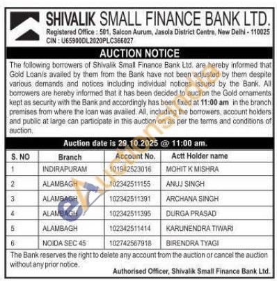 Shivalik Small Finance Bank Ltd Gold Auctions Auction in New Delhi