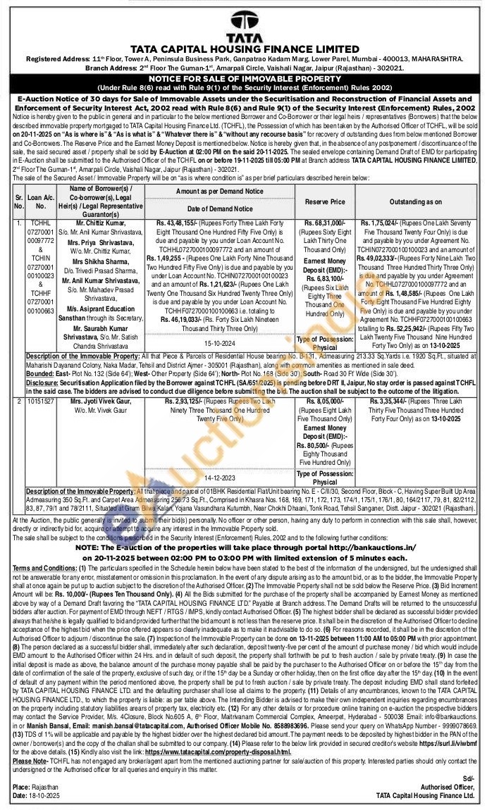 Description of the Immovable Property: All that Piece & Parcels of Residential House bearing No. B-131. Admeasuring 213.33 Sq. Yards ie. 1920 Sq.Ft., situated at Maharishi Dayanand Colony, Naka Madar, Tehsil and District Ajmer-305001 (Rajasthan), along with common amenities as mentioned in sale deed Bounded: East-Plot No. 132 (Sde 64): West-Other Property (Side 64); North Plot No. 168 (Side 30); South-Road 30 Fr Wide (Side 30).