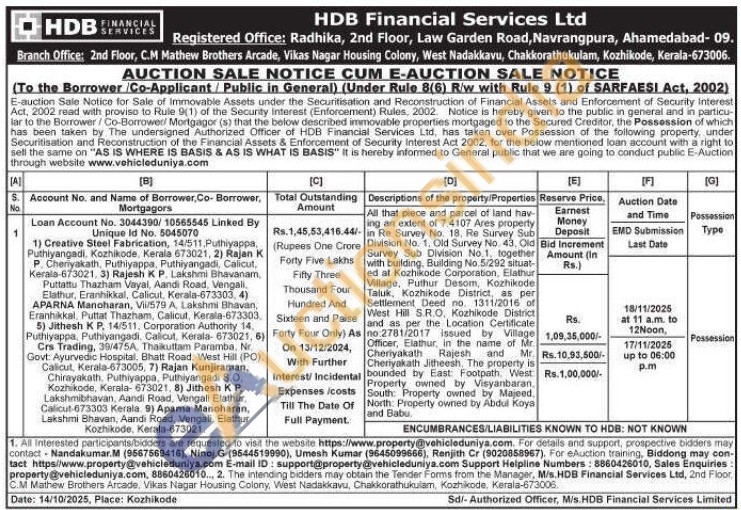 All that piece and parcel of land hav ing an extent of 7.4107 Ares property /- in Re Survey No. 18. Re Survey Sub Division No. 1. Old Survey No. 43. Old Survey Sub Division No. 1, together with building, Building No.5/292 situat-ed at Kozhikode Corporation, Elathur Village, Puthur Desom, Kozhikode Taluk, Kozhikode District, as per Settlement Deed no. 1311/2016 of West Hill S.RO, Kozhikode District and as per the Location Certificate no:2781/2017 issued by Village Officer, Elathur, in the name of Mr. Cheriyakath Rajesh and Mr. Cheriyakath Jitheesh. The property is bounded by East Footpath West Property owned by Visyanbaran, South: Property owned by Majeed. North Property owned by Abdul Koya and Babu