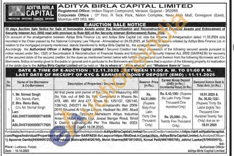 Contact Nos: Aditya Birla Capital Limited, Authorized Officer- 1 ) Apoorva Danthi(9930909725), Ved Prakash Mishra (9004026790), Mohit Sharma (9873913955), Komal Patil (9867895795), Jahirul Laskar (9706003075)