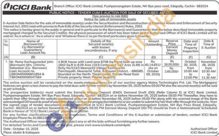 4 BHK house with Land area 8708 Sq.ft and built-up area 1843 Sq.ft in 8.09 Ares (19.9 Cents) and 1.82 Ares (4,49) in ReSy No.523/3 Meenachil Village, Kazhuvanal Panchayath, Meenachil Taluk, Kottayam District,-686585 Bounded on the North: Thodu South. Private Road East: Private property West: Private property