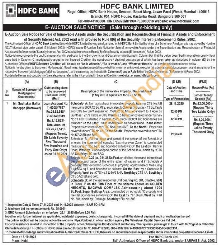 Schedule- A: Non agricultural immovable property bearing CTS No 4/B measuring 8609.42 Sq.Mtrs, equivalent to 2 Acres 5 Guntas-13 Sq. Yards and CTS No.5/A/1 measuring 7598.92 Sq.Mts.. equivalent to 1 Acre 35 Gunthas 12:1/9 Yards in CTS Ward No.5 having or covered under Survey No.11 and 10 situated in Karwar Road, Hubli-588059 and boundaries are as under. To the East: Public Road known as Karwar Road. To the West: Properties covered under CTS No.6 and 5A/2. To the North: Properties covered under CTS No.4A, To the South: Properties covered under CTS No.5/A/2,58 and 5A/3.Schedule- B: All that piece and parcel of the portion of the Schedule A wherein the commercial complex "Laxminarayan Zone is constructed measuring 31,353 sq ft. and bounded as follows: On the East by: Karwar Road, West by: Undeveloped portion of the Schedule A, North by: CTS 4A, South by: 4C and 5A/3,Schedule-C: 0.22 i.e., 311.35 Sq Feet, un-divided share and interest in all the piece and parcel of the entire extent of vacant land in Schedule A property, after excluding Schedule B property, approximately Measuring 1,41,523 sq.ft. and bounded as follows: On the East by: Schedule B Property, West by: CTS No.6 & 5A/2 & 4A, North by: CTS 4A, South by: CTS 5A/2.5B and 5A/3.Schedule-D: All the said residential Unit bearing No. 504, (Flat No. 504) in Block 'T' on the Fifth Floor of the scheme known as GOLDEN HEIGHTS, BAGWAN COMPLEX Admeasuring about 1000 Sq. Feet, Super Built up Area, constructed on schedule "C property And the Flat Boundaries as follows: On the East by: "H" Block, West by: Flat No. 501, North by: Passage, South by: Flat No. 503.