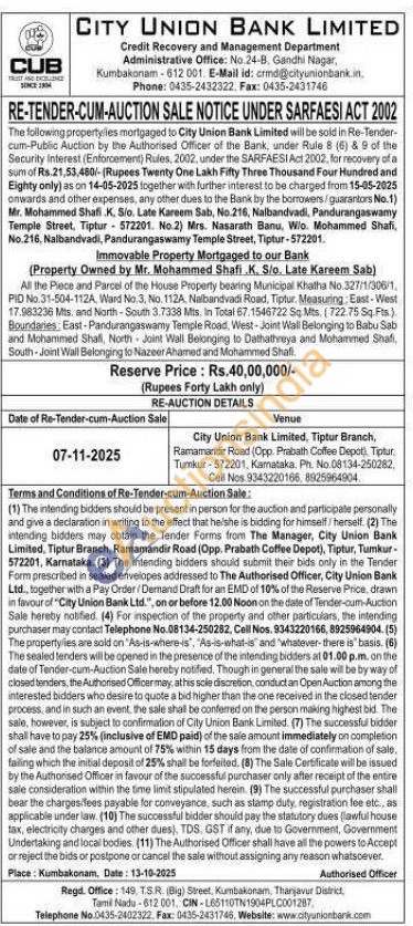 All the Piece and Parcel of the House Property bearing Municipal Khatha No.327/1/306/1 PID No.31-504-112A, Ward No. 3, No. 112A. Nalbandvadi Road, Tiptur. Measuring East-West 17.983236 Mts, and North-South 3.7338 Mts. In Total 67,1546722 Sq Mts, (722.75 Sq. Fts.) Boundaries: East-Pandurangaswamy Temple Road, West-Joint Wall Belonging to Babu Sab and Mohammed Shall, North Joint Wall Belonging to Dathathreya and Mohammed Shafi, South Joint Wall Belonging to Nazeer Ahamed and Mohammed Shafi