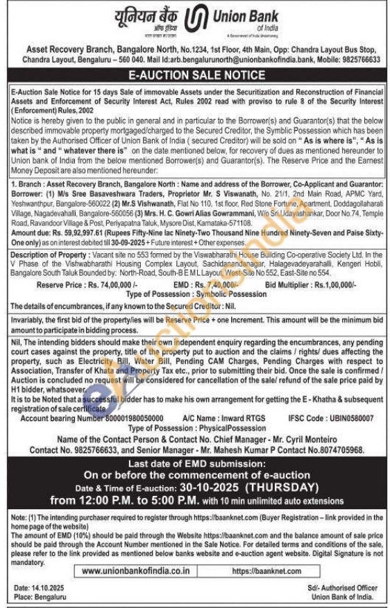 Description of Property: Vacant site no 553 formed by the Viswabharathi House Building Co-operative Society Ltd. In the V Phase of the Vishwabharathi Housing Complex Layout, Sachidanandanagar, Halagevadeyarahalli, Kengeri Habli, Bangalore South Taluk Bounded by: North-Road, South-BEML Layout, West-Site No 552, East-Site no 554