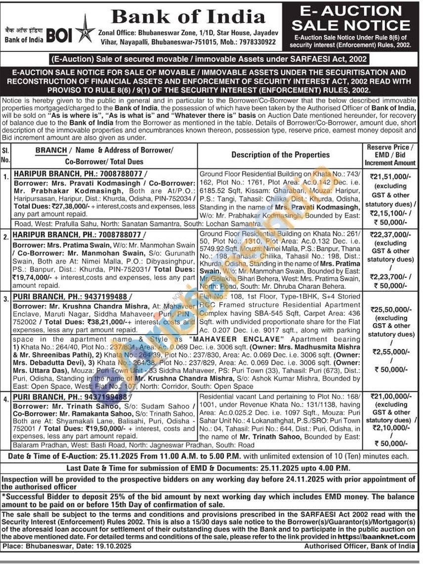 1)Ground Floor Residential Building on Khata No.: 743/162, Plot No.: 1761, Plot Area: Ac.0.142 Dec. i.e.. 6185.52 Sqft, Kissam: Gharabari, Mouza: Haripur, P.S.: Tangi, Tahasil: Chilika, Dist.: Khurda, Odisha, Standing in the name of Mrs. Pravati Kodmasingh, W/o: Mr. Prabhakar Kodmasingh, Bounded by East Road, West: Prafulla Sahu, North: Sanatan Samantra, South: Lochan Samantra.