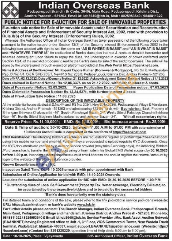 All the residential house situated at D. No.4/4 and RS No: 203/1. New S.No:203/8, Pedaparupudi Village & Mandalam, Krishna District, Andhra Pradesh-521263 and admeasuring 123 Sq Yards with Boundaries: East: Property of Srirangam Srinivasa Chakravarthi-46", South: Panchayat Bazar-24", West: Site of Paladugu Chandra Sekhara Rao-46", North: Site of Gogineni Madhusudanarao and common bazar-24". With all easementary rights