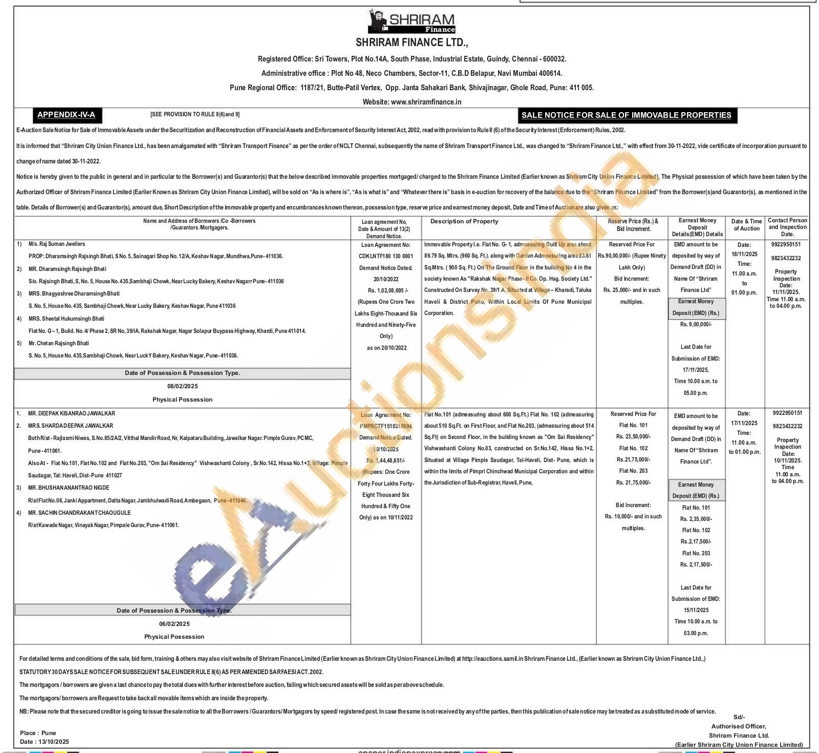 Flat No.101 jadmeasuring about 600 Sq.Ft.) Flat No. 162 (admeasuring about 510 Sq. Ft, on First Floor, and Flat No.203, (admeasuring about 514 Sq.Ft on Second Floor, in the buiding known as "Om Sai Residency" Vishwashanti Colony No.03, constructed an Sr.No.142, Hissa No.1+2, Situated at Village Pimple Saudagar, Tal-Haveli, Dist-Pune, which is within the limits of Pimpri Chinchwad Municipal Corporation and within the Jurisdiction of Sub-Registrar, Havell, Pune
