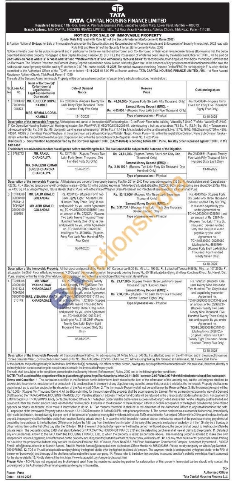 Description of the inmovable Property: All that consisting of Flat No. 14, admeasuring 50.74 Sq. Mit le 546 Sq. Fts (Buit up areal on the 4TH Floor, and in the project known as Shree Santoshi Vhar, constructed on land bearing Plot No 60 out of Gat No. 25523, (Old 5. No. 25) admessuring 32454. Mir Situated at Kadamvas Tal Havel Dot Pune