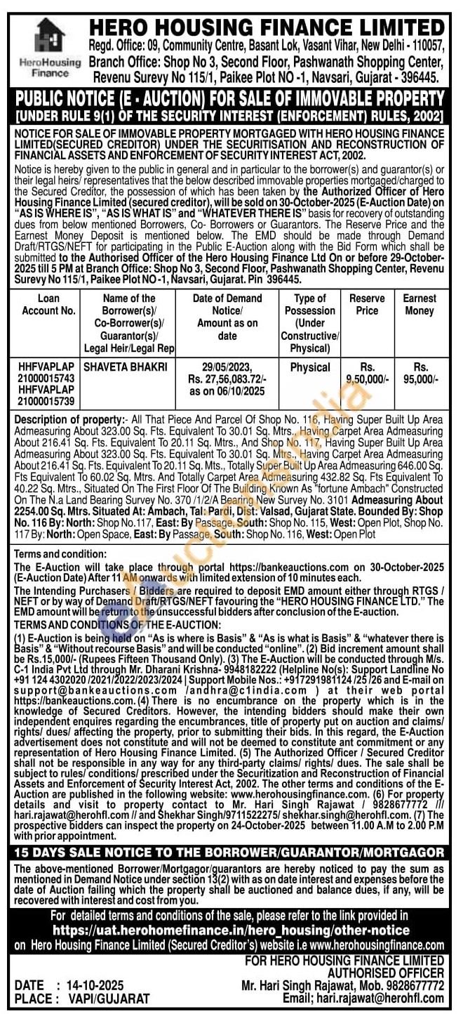 Description of property: All That Piece And Parcel Of Shop No. 116, Having Super Built Up Area Admeasuring About 323.00 Sq. Fts. Equivalent To 30.01 Sq. Mtrs., Having Carpet Area Admeasuring About 216.41 Sq. Fts. Equivalent To 20.11 Sq. Mtrs., And Shop No. 117, Having Super Built Up Area Admeasuring About 323.00 Sq. Fts. Equivalent To 30.01 Sq. Mtrs., Having Carpet Area Admeasuring About 216.41 Sq. Fts. Equivalent To 20.11 Sq. Mts., Totally Super Built Up Area Admeasuring 646.00 Sq. Fts Equivalent To 60.02 Sq. Mtrs. And Totally Carpet Area Admeasuring 432.82 Sq. Fts Equivalent To 40.22 Sq. Mtrs., Situated On The First Floor Of The Building Known As "fortune Ambach" Constructed On The N.a Land Bearing Survey No. 370/1/2/A Bearing New Survey No. 3101 Admeasuring About 2254.00 Sq. Mtrs. Situated At: Ambach, Tal: Pardi, Dist: Valsad, Gujarat State. Bounded By: Shop No. 116 By: North: Shop No. 117, East: By Passage, South: Shop No. 115, West: Open Plot, Shop No. 117 By: North: Open Space, East: By Passage, South: Shop No. 116, West: Open Plot