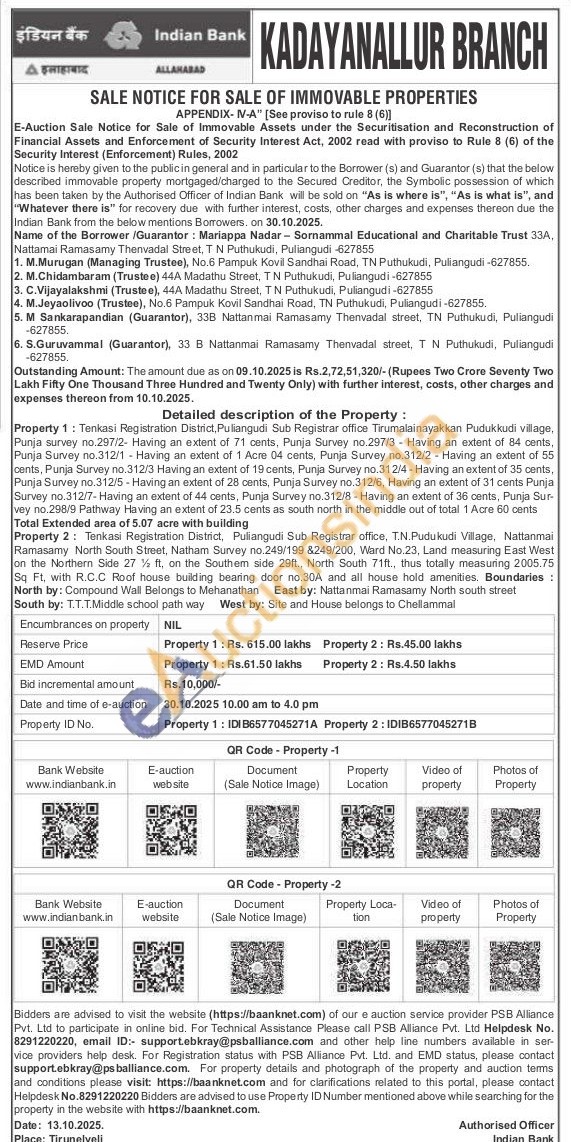 Property 1: Tenkasi Registration District, Puliangudi Sub Registrar office Tirumalainayakkan Pudukkudi village, Punja survey no.297/2- Having an extent of 71 cents, Punja Survey no.297/3 Having an extent of 84 cents, Punja Survey no.312/1-Having an extent of 1 Acre 04 cents, Punja Survey no.312/2-Having an extent of 55 cents, Punja Survey no.312/3 Having an extent of 19 cents, Punja Survey no.312/4-Having an extent of 35 cents, Punja Survey no.312/5-Having an extent of 28 cents, Punja Survey no.312/6, Having an extent of 31 cents Punja Survey no.312/7-Having an extent of 44 cents, Punja Survey no.312/8 - Having an extent of 36 cents, Punja Sur-