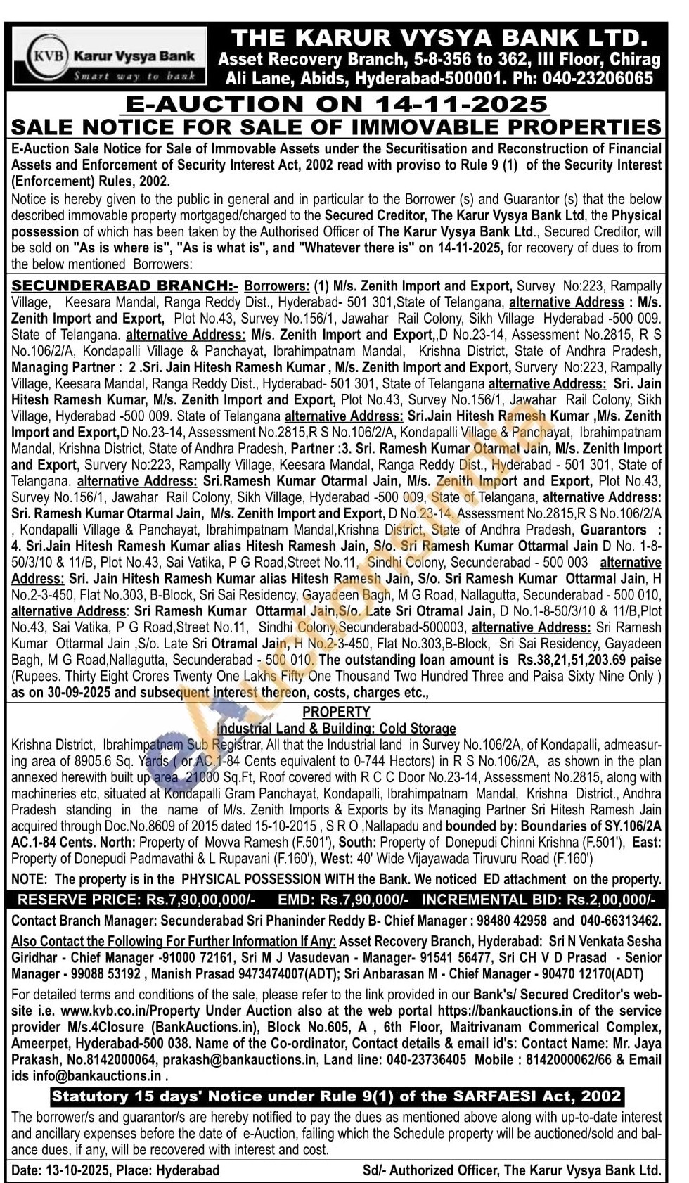 Krishna District, Ibrahimpatnam Sub Registrar, All that the Industrial land in Survey No. 106/2A, of Kondapalli, admeasur-ing area of 8905.6 Sq. Yards (or AC.1-84 Cents equivalent to 0-744 Hectors) in R S No. 106/2A, as shown in the plan annexed herewith built up area 21000 Sq. Ft, Roof covered with RCC Door No.23-14, Assessment No.2815, along with machineries etc, situated at Kondapalli Gram Panchayat, Kondapalli, Ibrahimpatnam Mandal, Krishna District., Andhra Pradesh standing in the name of M/s. Zenith Imports & Exports by its Managing Partner Sri Hitesh Ramesh Jain acquired through Doc. No.8609 of 2015 dated 15-10-2015, S RO, Nallapadu and bounded by: Boundaries of SY.106/2A AC.1-84 Cents. North: Property of Movva Ramesh (F.501'), South: Property of Donepudi Chinni Krishna (F.501'), East: Property of Donepudi Padmavathi & L Rupavani (F.160'), West: 40' Wide Vijayawada Tiruvuru Road (F.160')NOTE: The property is in the PHYSICAL POSSESSION WITH the Bank. We noticed ED attachment on the property.