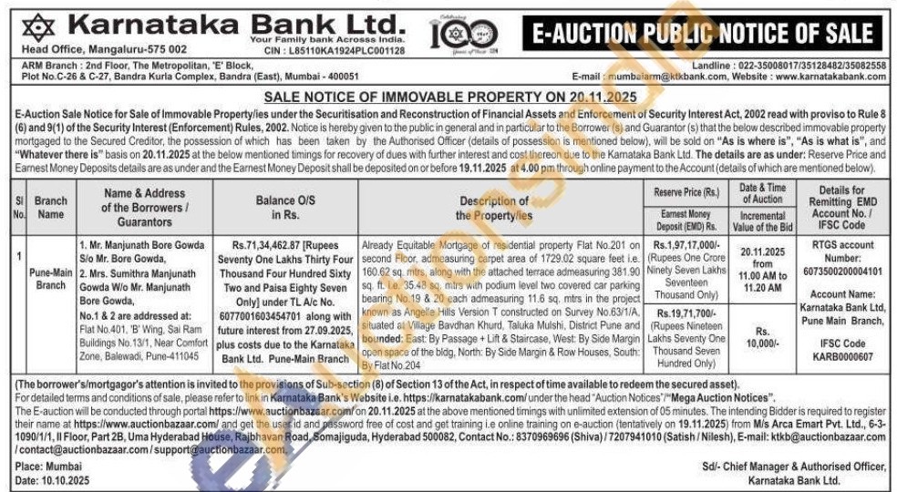 Already Equitable Mortgage of residential property Flat No.201 on second Floor, admeasuring carpet area of 1729.02 square feet i.e. 160.62 sq. mtrs, along with the attached terrace admeasuring 381.90 sq. ft. 1.e. 35.48 sq, mtrs with podium level two covered car parking bearing No.19 & 20 each admeasuring 11.6 sq. mtrs in the project known as Angelle Hills Version T constructed on Survey No.63/1/A situated at Village Bavdhan Khurd, Taluka Mulshi, District Pune and bounded: East: By Passage + Lift & Staircase, West: By Side Margin open space of the bldg, North: By Side Margin & Row Houses, South: By Flat No.204