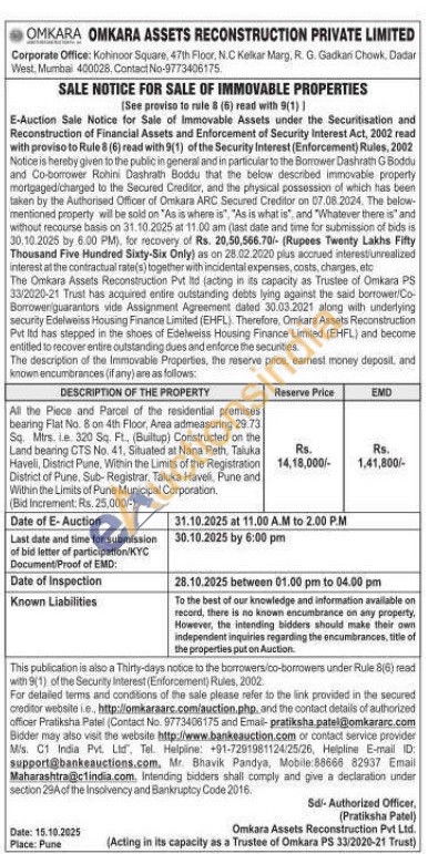 All the Piece and Parcel of the residential premises bearing Fiat No. 8 on 4th Floor, Area admeasuring 29.73 Sq. Mirs. Le 320 Sq. Ft., (Builtup) Constructed on the Land bearing CTS No. 41, Situated at Nana Peth, Taluka Haveli, District Pune, Within the Limits of the Registration District of Pune, Sub-Registrar, Taluka Havel, Pune and Within the Limits of Pune Municipal Corporation (Bid Increment: Rs. 25,000/-)