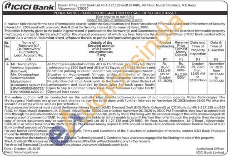 All that the Residential Flat No. 401 in Third Floor, in Survey No. 26/11 admeasuring 1200 Sq.ft and UDS of 41 5q yds or 34.281 Sq.mtrs and 80 Sft Car parking in Cellar Floor of Sai Surya Sravani Apartment Situated at Aganampudi Village, within the limits of Greater Visakhapatnam, Gajuwaka Mandal, Visakhapatnam District, in the Registration district of Anakapalli, in the Sub-Registration District of Lankelapalem and bounded by East: Open Set back space South: Open to Sky & Common Staire Case West: Common Corridor North: Open set back space