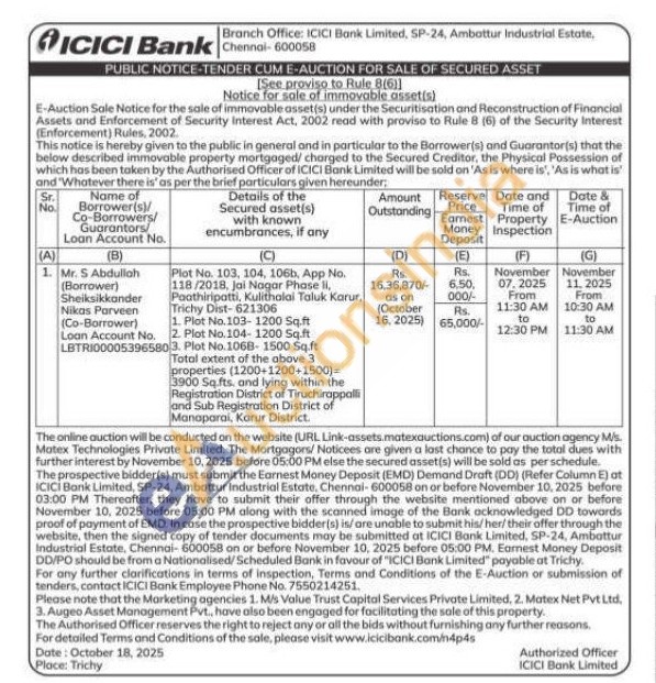 Plot No. 103, 104, 106b, App No. 118/2018, Jai Nagar Phase li, Paathiripatti, Kulithalal Taluk Karur, Trichy Dist-621306 1. Plot No.103-1200 Sq.ft 2. Plot No. 104-1200 Sq.ft 3. Plot No.1068-1500 Sq.ft Total extent of the above 3 properties (1200+1200+1500)= 3900 Sq.fts, and lying within the Registration District of Tiruchirappalli and Sub Registration District of Manaparai, Karur District