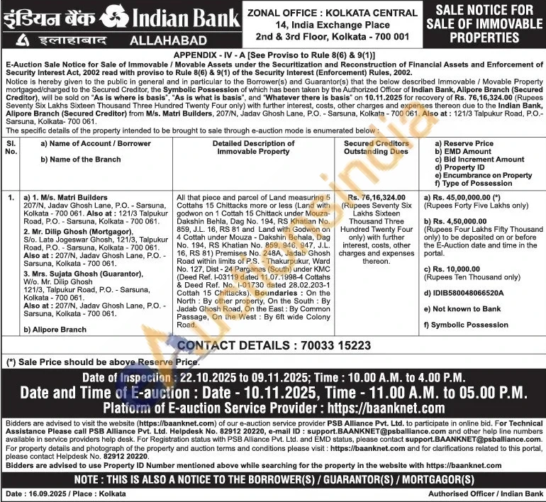 All that piece and parcel of Land measuring 5 Cottahs 15 Chittacks more or less (Land with godwon on 1 Cottah 15 Chittack under Mouza-Dakshin Behla, Dag No. 194, RS Khatian No. 859, J.L. 16, RS 81 and Land with Godwon on 4 Cottah under Mouza - Dakshin Behala, Dag No. 194, RS Khatian No. 859, 946, 947, J.L. 16, RS 81) Premises No. 248A, Jadab Ghosh Road within limits of P.S. - Thakurpukur, Ward No. 127, Dist-24 Parganas (South) under KMC (Deed Ref. 1-03119 dated 11.07.1998-4 Cottahs & Deed Ref. No. 1-01730 dated 28.02.203-1 Cottah 15 Chittacks). Boundaries: On the North By other property, On the South: By Jadab Ghosh Road, On the East: By Common Passage, On the West: By 6ft wide Colony Road.