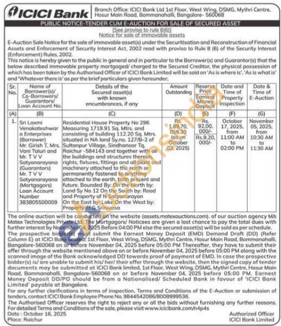 Residential House Property No 296 Measuring 1719.91 Sq. Mtrs. and consisting of building 112.20 Sq. Mtrs. situated in NA land Sy.no. 127/B-2 of Sultanpur Village, Sindhanoor Tq. Raichur-584143 and together with all the buildings and structures thereon, rights, fixtures, fittings and all plant and machinery attached to the earth or permanently fastened to anything attached to the earth, both present and future. Bounded By: On the North by: Land Sy No 12 On the South by: Road and Property of N Satyanarayan On the East by: Lake On the West by: Property of G Srinivasa