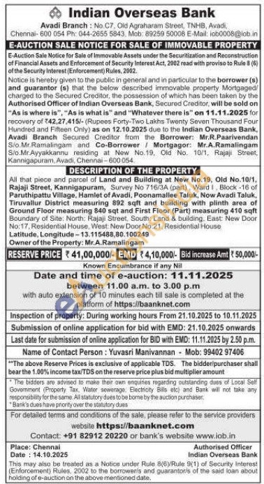 All that piece and parcel of Land and Building at New No.19, Old No.10/1. Rajaji Street, Kannigapuram, Survey No 716/3A (part), Ward 1, Block-16 of Paruthipattu Village, Hamlet of Avadi, Poonamallee Taluk, Now Avadi Taluk, Tiruvallur District measuring 892 sqft and building with plinth area of Ground Floor measuring 840 sqt and First Floor (Part) measuring 410 sqft Boundary of Site: North: Rajaji Street, South: Land & building, East: New Door No: 17, Residential House, West New Door No:21, Residential House Latitude, Longitude-13.115488,80.100249