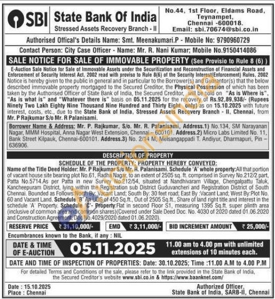 property:All that portion of vacant house site bearing plot No.61, Radha Nagar, to an extent of 2505 sq. ft. comprised in Survey No.212/2 part, Patta No.5714.As per Patta in new Survey No.212/54, situated at Nandhivaram Village, Chengalpattu Taluk, Kancheepuram District, lying within the Registration sub District Guduvancheri and Registration District of South Chennai. Bounded as Follows:North By: Vacant Land; South By: 30 feet road, East By : Vacant Land; West By:Plot No. 60 and Vacant Land. Schedule 'B' An UDS of 450 Sq.ft., Out of 2505 Sq.ft., Share of land right title and interest in the schedule 'A' Property. Schedule 'C'- Property Flat in second Floor S1, measuring 1395 Sq.ft. super plinth area (inclusive of common area and common shares) (Covered under Sale Deed Doc. No. 4030 of 2020 dated 01.06.2020 and Construction Agreement, Doc No. 4029/2020 dated 01.06.2020).