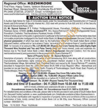 All that part and parcel of land admessuring 26.31 Ares along with all constructions, improvements, easementary rights existing and appurtenant thereon situated in Sy No. 3/141E with Thachanattukara Village, Mannarkkad Taluk, Palakkad District and cerned by Mr. Siyavud Rahman PT, marefully described in Assignment Deed No. 2267/1999 dated 04.05.1999 of Sub Registrar Office Mannarkikad and bounded on (as per Deed No. 2287/19991, North Property of Thoduvakkappu South Road East Property of Thoduvakkappu, West: Property assigned to Siyavul Haq