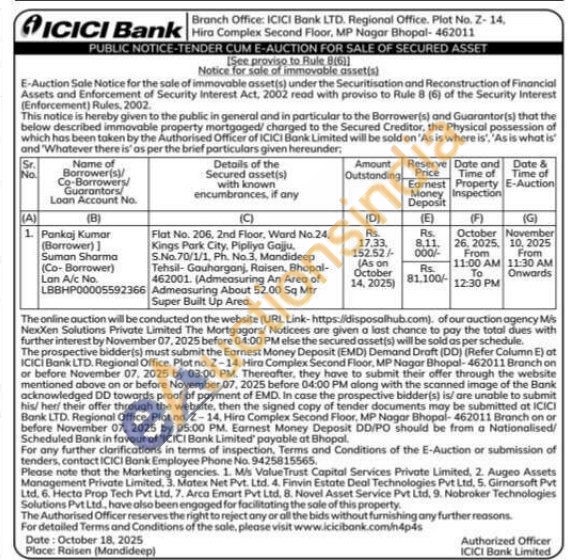 Flat No. 206, 2nd Floor, Ward No.24, Kings Park, City, Pipliya Gajju, S.No. 70/1/1, Ph. No.3, Mandideep Tehsil-Gauharganj, Roisen, Bhopal-462001. (Admeasuring An Area of Admeasuring About 52.00 Sq Mtr Super Built Up Area