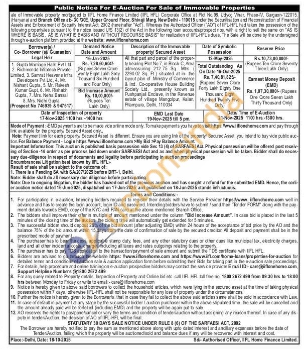 All that part and parcel of the proper-ty bearing Plot No.7, in Block-C, Area admeasuring 212.75 Sq. Mirs ( 2290.02 Sq. Ft.) situated at in- the layout plan of Ministry of Commerce & Ind. Co-operative House Building Society Ltd, presently known as Pushpanjal Enclave, in the Revenue estate of village Mangoipur, Kalan, Pitampura, Delhi, 110034
