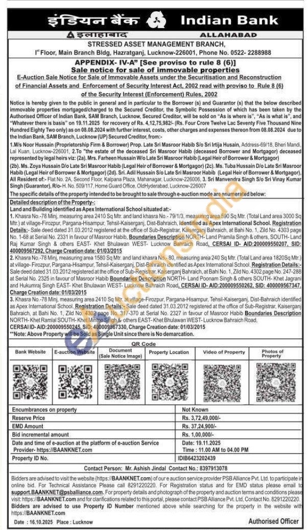 1. Khasra No.-78 Minj, measuring area 2410 Sq Mtr. and land khasra No-79/1/3, measuring area 590 Sq Mtr. (Total Land area 3000 Sq Mtr.) at village-Firozpur, Pargana-Hisampur, Tehsil-Kaiserganj, Dist-Bahraich, Identified as Apex International School. Registration Details:-Sale deed dated 31.03.2012 registered at the office of Sub-Registrar, Kaiserganj Bahraich, at Bahi No. 1, Zild No. 4303 page No. 1-68 at Serial No. 2331 in favour of Masroor Habib, Boundaries Description NORTH-Land Pramila Singh & others, SOUTH-Land Raj Kumar Singh & others EAST- Khet Bhulawan WEST- Lucknow Bahraich Road, CERSAI ID-AID:200009550207, SID: