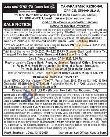 Model: ETIOS GD, Manufacturer: TOYOTA, Year of Man: 2015 Chassis No: MBJB49BT0000975390215, Registration No: KL-41-J-7200, Valuation Amount Rs. 2,10,000/-, Date of valuation: 09-09-2025