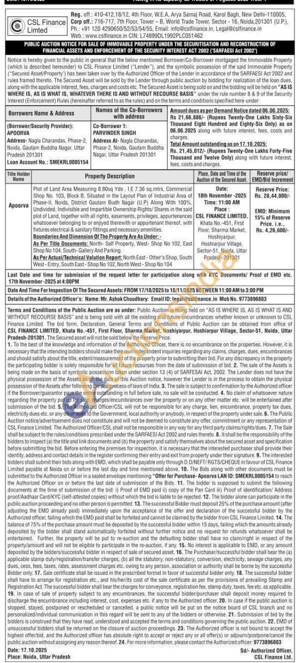 Plot of Land Area Measuring 80sq Yds LE 7.36 sqmtrs, Commercial Shop No. 103, Block B, Situated in the Layout Plan of Industrial Area of Phase-II. Noida, District Goutam Budh Nagar (UP) Along With 100% Undivided, Indivisible and impartible Ownership Rights/Shares in the said plot of Land, together with all rights, easements, privileges, appurtenances whatsoever belonging to or enjiyed therewith or appurtenant appurtenant thereof, with fixtures electrical & sanitary fittings and necessary amenities
