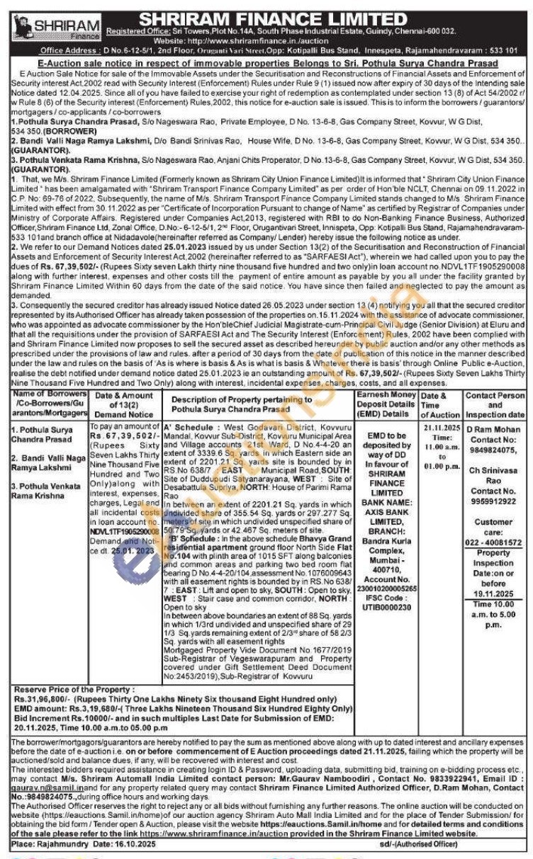 Schedule: West Godavari District, Kovvuru Mandal, Kowur Sub-District, Kovvuru Municipal Area and Village accounts 21st Ward, D No.4-4-20 an extent of 3339.6 Sq. yards in which Eastern side an extent of 2201.21 Sq. yards site is bounded by in RS.No 638/7 EAST Municipal Road, SOUTH Site of Duddupudi Satyanarayana, WEST: Site of Desabattula Supriya, NORTH: House of Parimi Rama Rao In between an extent of 2201.21 Sq. yards in which undivided share of 355.54 Sq. yards or 297.277 Sq. meters of site in which undivided unspecified share of 50.79 Sq. yards or 42.467 Sq. meters of site. 'B' Schedule: in the above schedule Bhavya Grand residential apartment ground floor North Side Flat No.104 with plinth area of 1015 SFT along balconies and common areas and parking two bed room flat bearing D No.4-4-20/104 assessment No. 1076009643 with all easement rights is bounded by in RS.No 638/7: EAST: Lift and open to sky, SOUTH: Open to sky, WEST: Stair case and common corridor, NORTH: Open to sky in between above boundaries an extent of 88 Sq. yards in which 1/3rd undivided and unspecified share of 29 1/3 Sq.yards remaining extent of 2/3 share of 58 2/3 Sq. yards with all easement rights Mortgaged Property Vide Document No. 1677/2019 Sub-Registrar of Vegeswarapuram and Property covered under Gift Settlement Deed Document