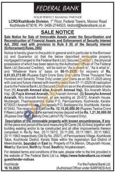 Description of the immovable property with known encumbrances, if any All the piece and parcel of the land measuring 90 Cents (36.43 Ares) together with building existing and/or to be constructed and all other improvements thereon comprised in Re-Sy Nos. 20:11:197/2, 20:11:200, 20:11:199/1, 20:11:196/2, 20:11:198/2 respectively (Old Sy No. 255/7), of Panniyankara Village, Kozhikode Taluk, Kozhikode District, Kerala State within the registration Sub District of Meenchanda, bounded on East by Property of P.A.Menon, Ottupurath House, West by: Bye lane, North by: Road, South by: Anyakaivasam.