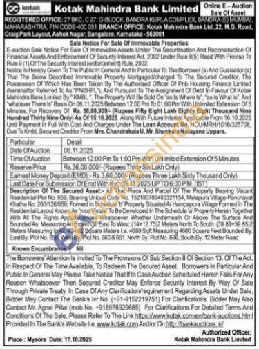 Description Of The Secured Asset All That Piece And Parcal Of The Property Bearing Vacant Residential Plot No 600, Bearing Unique Code No. 152100700400021154, Melapura Vifage Panchayat Khatha No. 200/126/859, Formed in Schedule "ly Property Situated At Hampapura Village Formed in The Rasidential Layout Known As "nice Vistas" To Be Developed in The Schedule 'a Property Herein Together With All The Rights Appurtenances Whatsoever Whether Undemeath Or Above The Surface And Bounded As: Measuring An Extent Of East To West: (14-12 752 Meters North To South (19.89-39.8512 Meters Measuring In All 434.62 Square Meters Le. 4880 Soft Measuring 4680 Square Feet Bounded By East By: Plot No 658, West By Plot No. 600&661, North By Plot No 666 South By: 12 Meter Pload